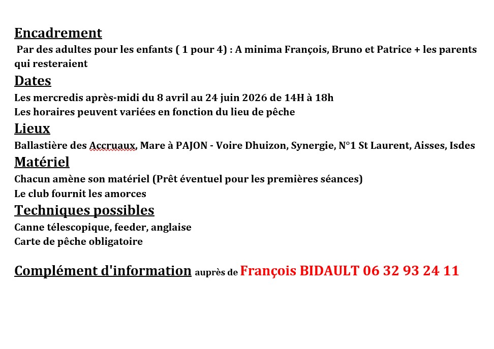 Vous désirez apprendre à pêcher, apprendre de nouvelles méthodes de pêche, n’hésitez pas à vous inscrire si vous vous êtes intéressé ou pour plus d’informations.